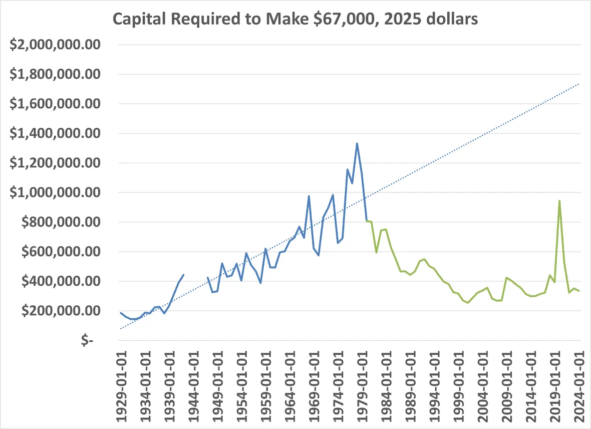 The capitalist class is dependent on both wealth and profit to run. With a profit rate of 20% the average American income of $67.000 can be achieved with a capital of $0.34 million. But if the profit rate is only 3% then $2.1 million is needed. Based on historical profit rates Villarreal draws this chart: