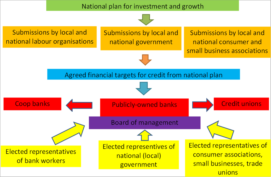 What is never put forward is to turn modern banking into a public service just like health, education, transport etc. If banks were a public service, they could hold the deposits of households and companies and then lend them out for investment in industry and services or even to the government. It would be like a national credit club. We could then make a state-owned banking system democratic and accountable to the public. That means directly elected boards, salary caps for top managers, and also local participation. Way back in 2012, I presented such an idea to the Institute of Labour Studies in Slovenia, as structured below.